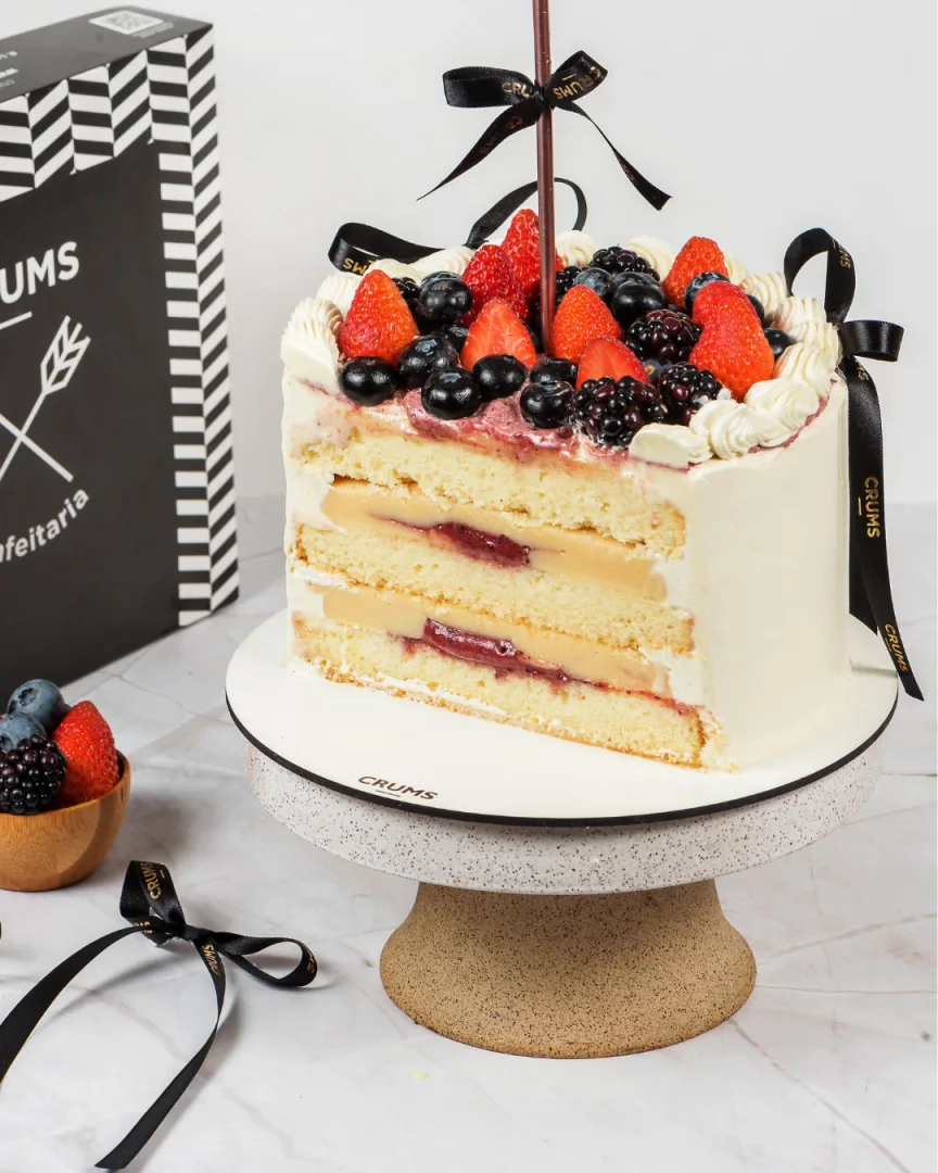 Um encontro cítrico e frutado que encanta a cada mordida! 💙🍋✨ * Bolo de Baunilha fofinho * Creme de Limão Siciliano * Delicioso caramelho de Frutas Vermelhas * Revestido com Buttercream * Finalizado com frutas vermelhas (disponível do dia)
