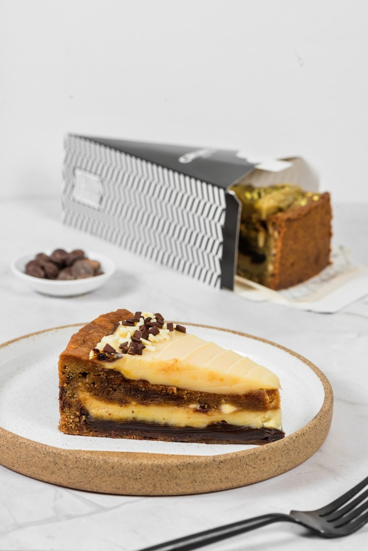 Base de cookie com gotas de chocolate preto e branco, super recheado com brigadeiro tradicional e brigadeiro de ninho.